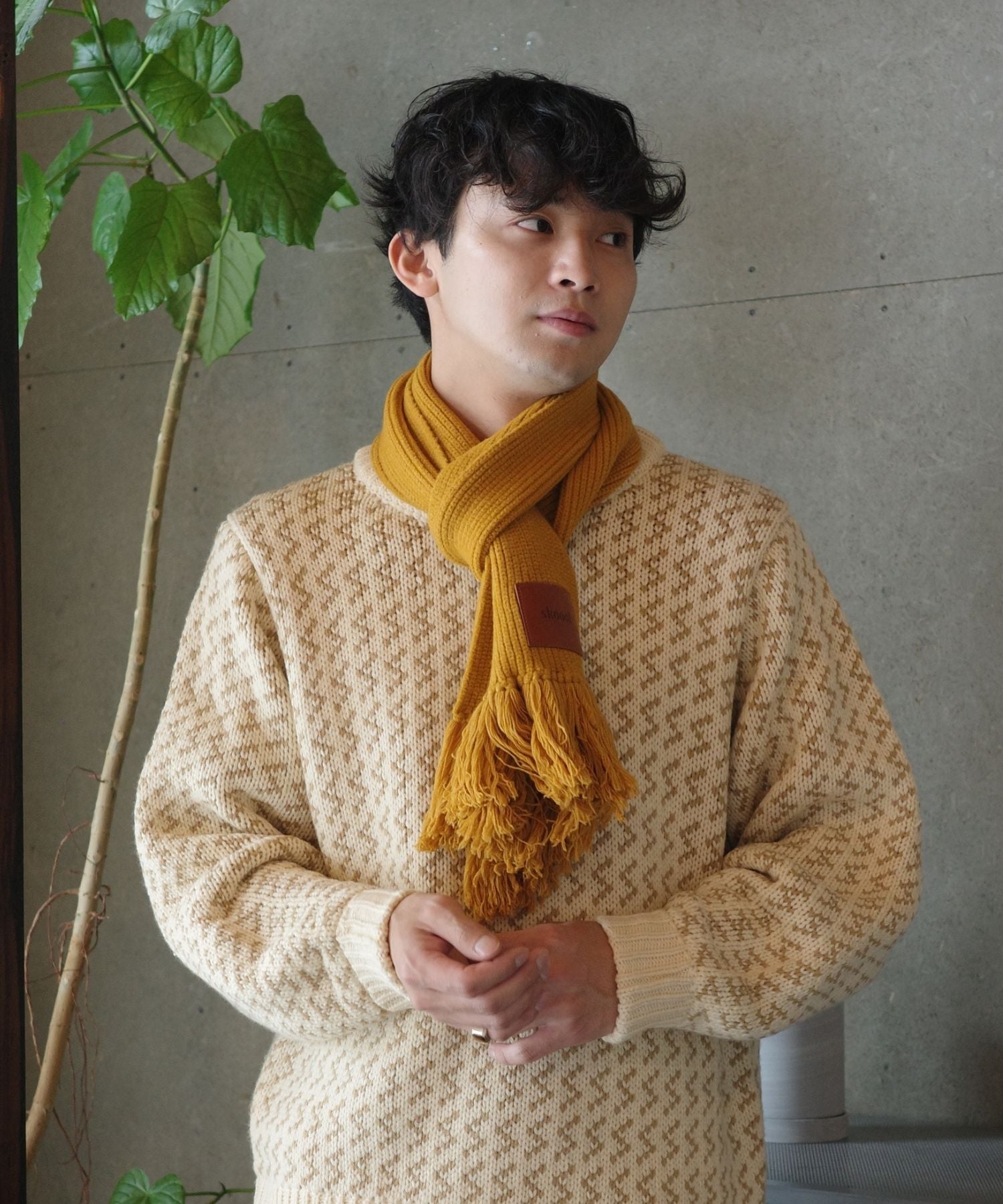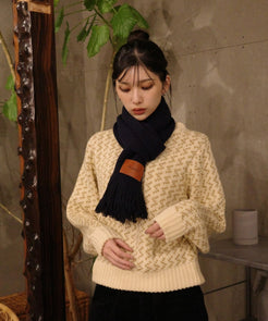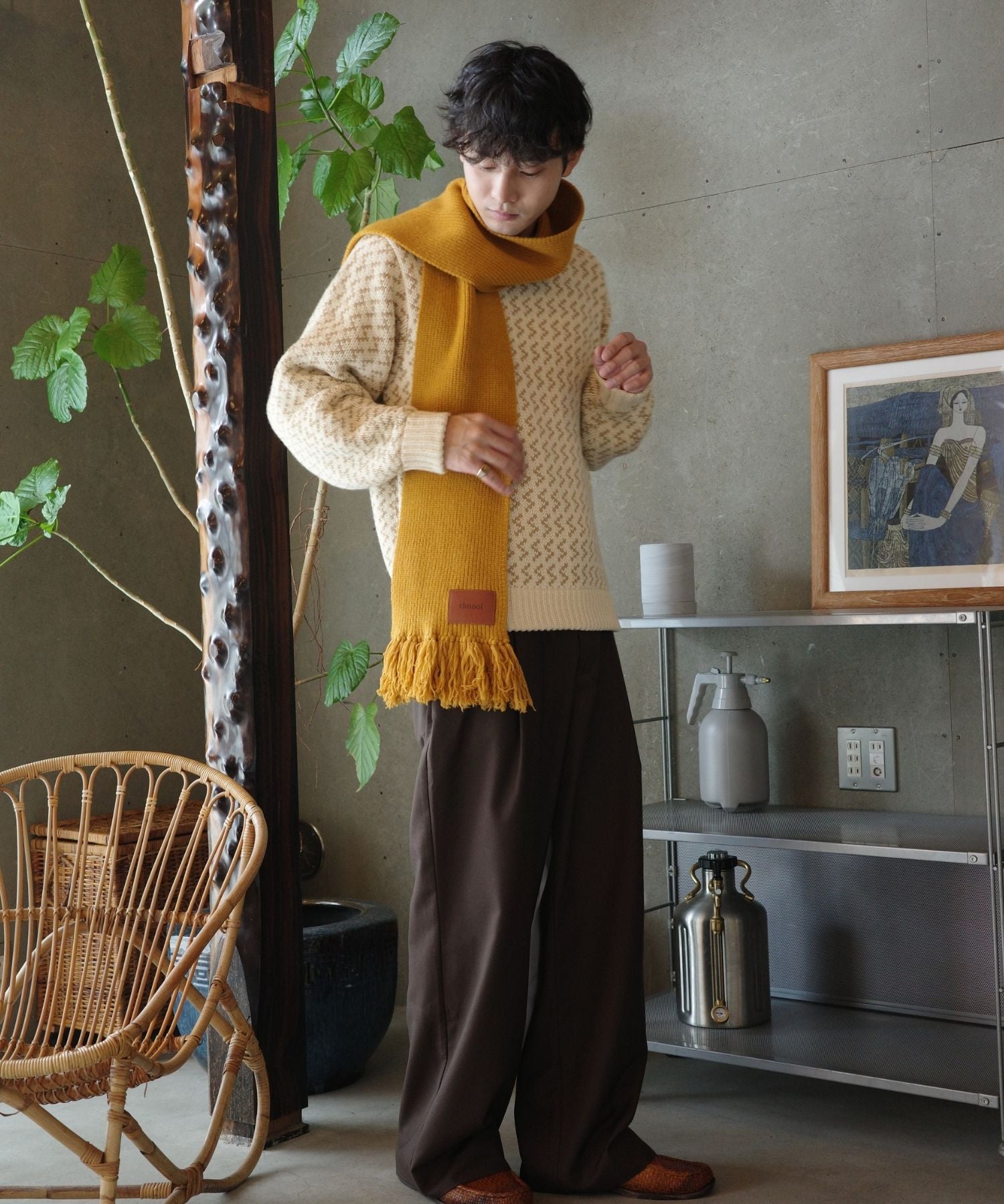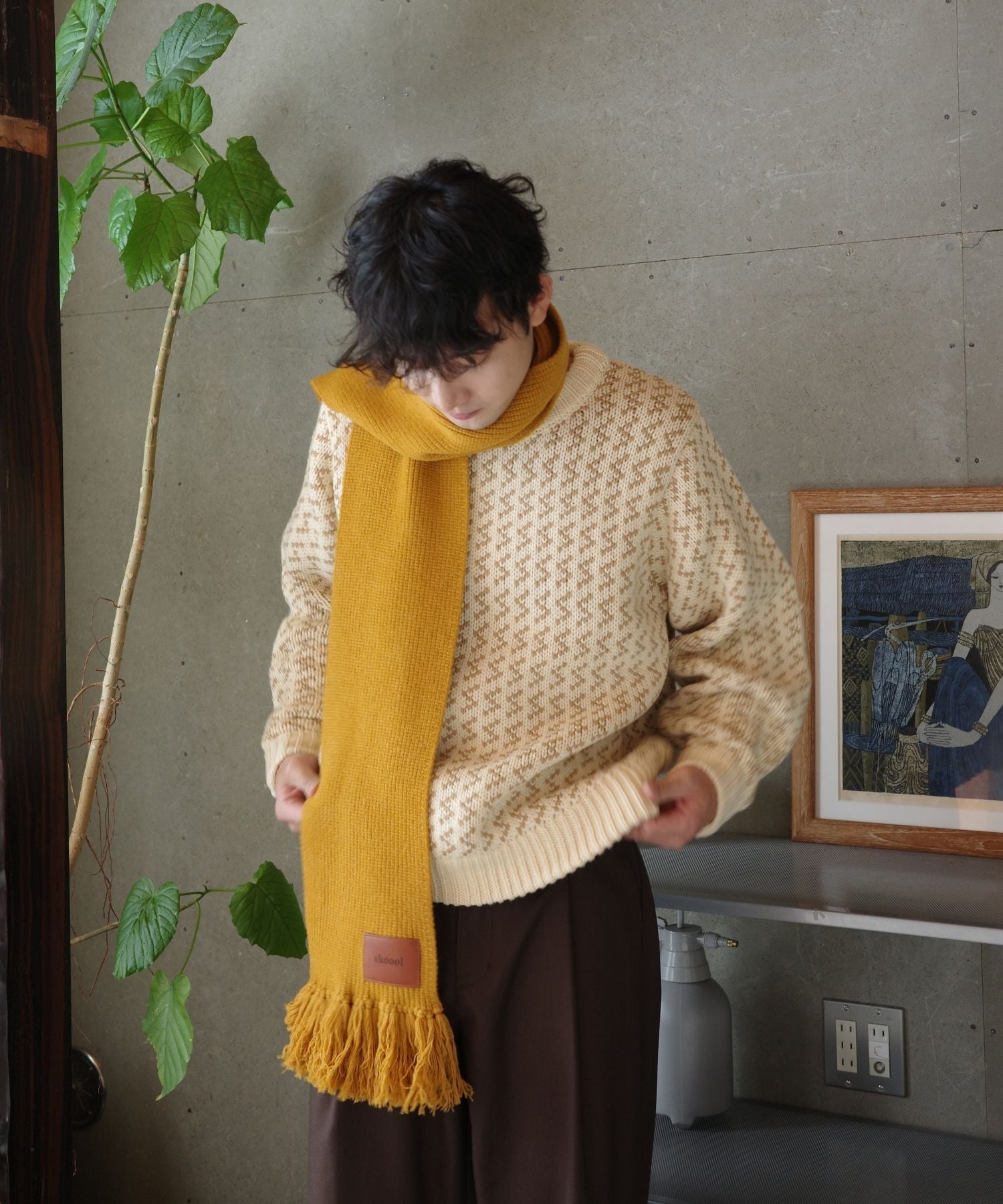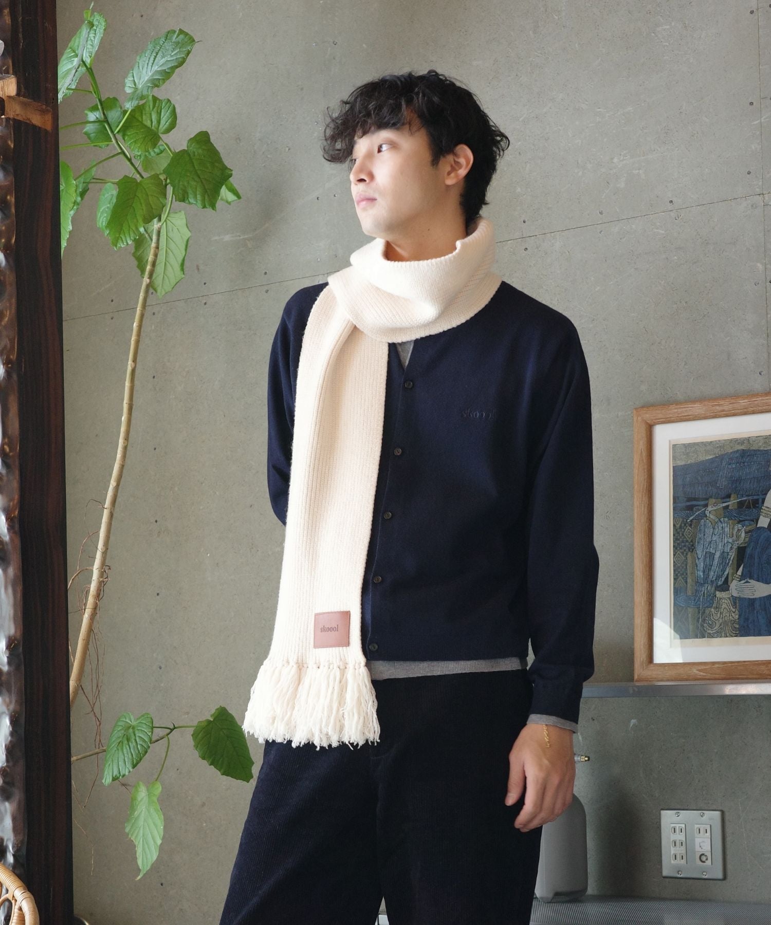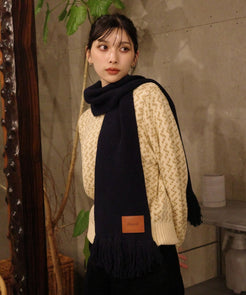 が出すぎない上品なリブ編みで、巻きやすく扱いやすいマフラー。柔らかいウール混で肌あたりが優しく、デイリーに使いやすい。端のフリンジは少しボリュームをつけて冬らしく、レザーパッチのブランドロゴが高級感を演出。定番のネイビー・アイボリーに加え、着こなしにアクセントを添えるマスタードも展開。