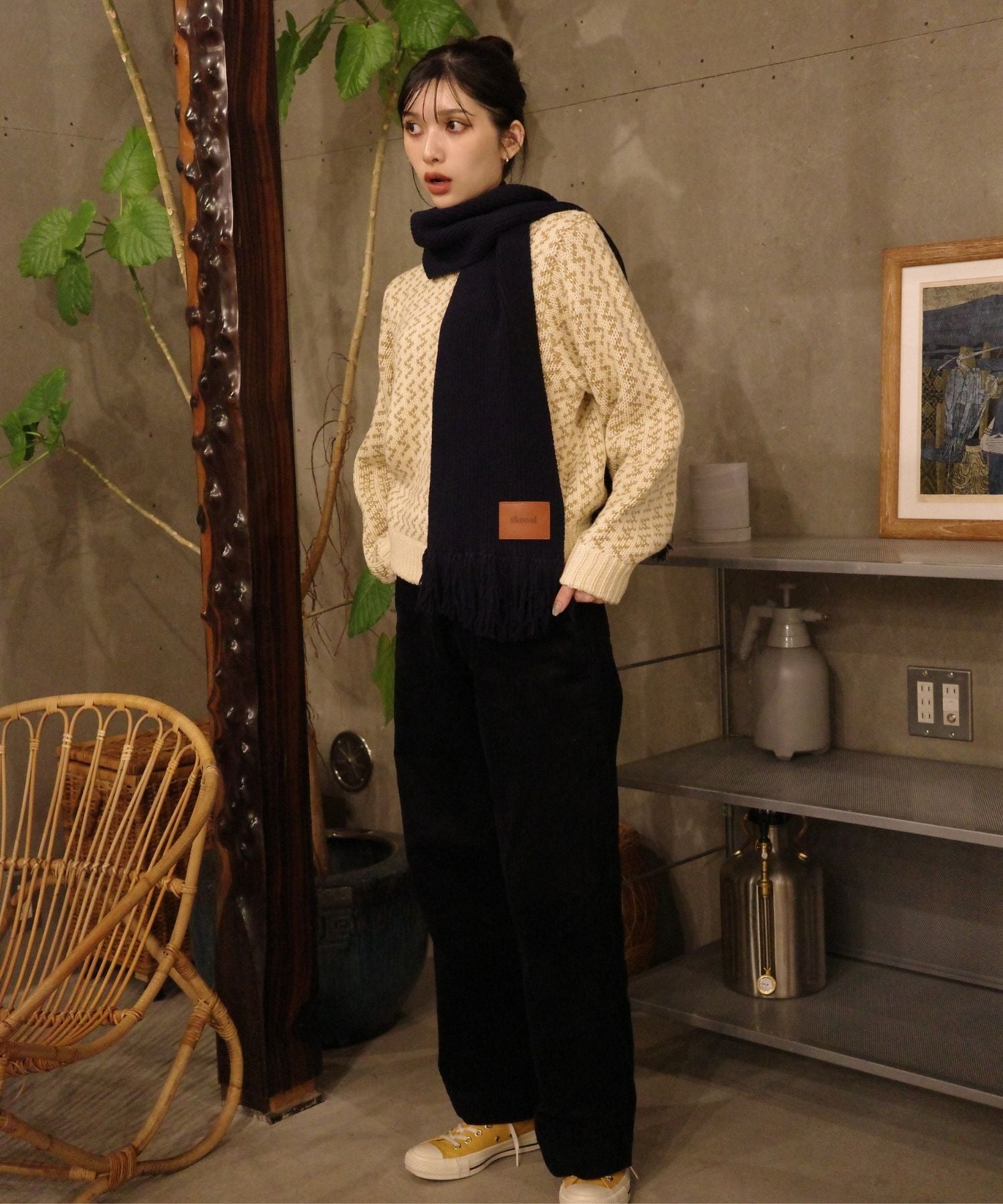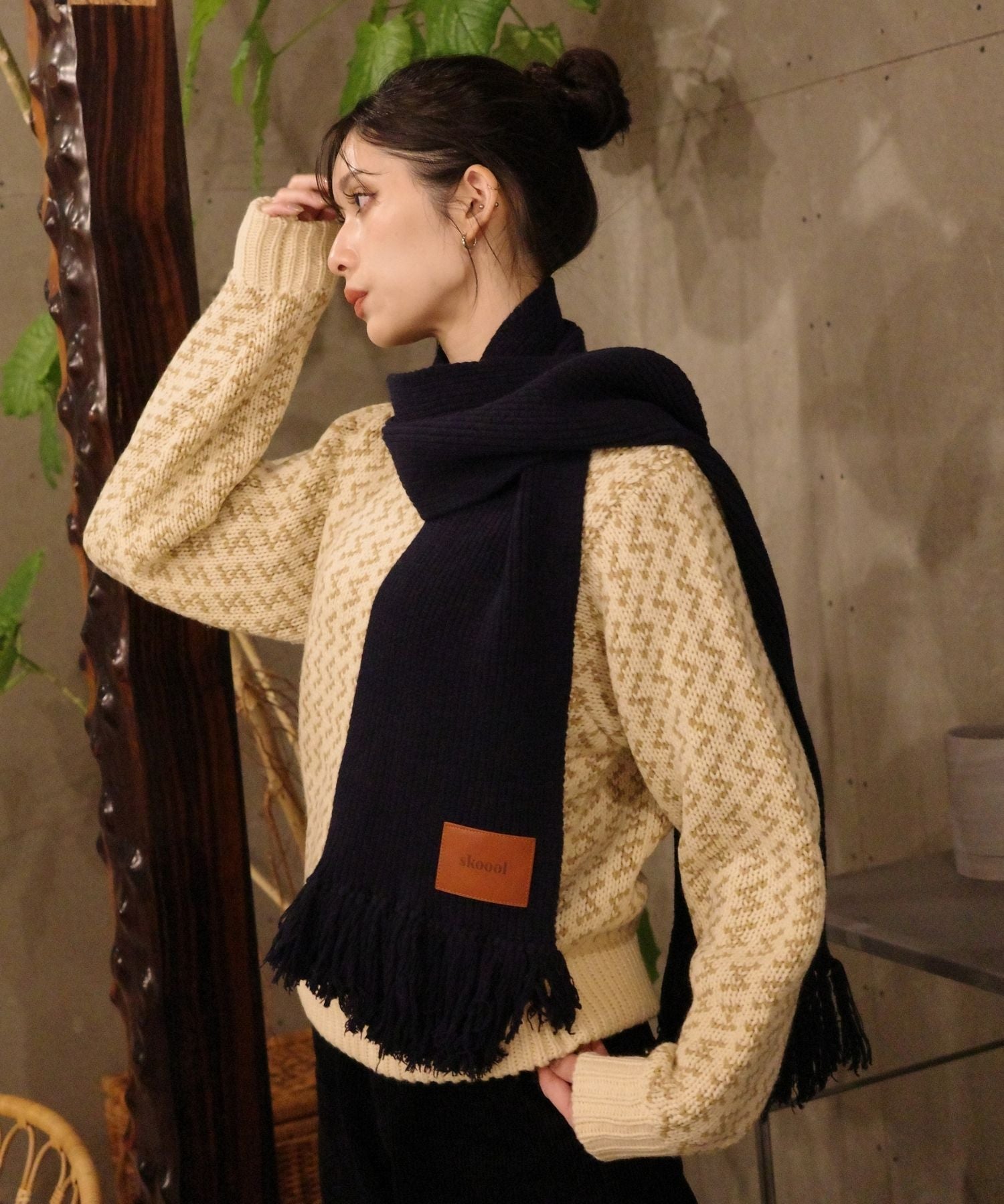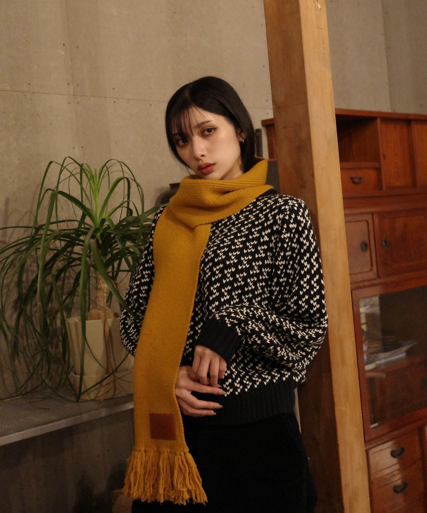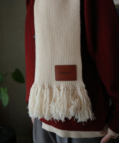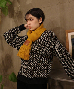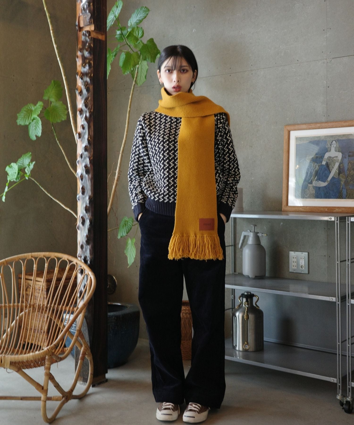 が出すぎない上品なリブ編みで、巻きやすく扱いやすいマフラー。柔らかいウール混で肌あたりが優しく、デイリーに使いやすい。端のフリンジは少しボリュームをつけて冬らしく、レザーパッチのブランドロゴが高級感を演出。定番のネイビー・アイボリーに加え、着こなしにアクセントを添えるマスタードも展開。