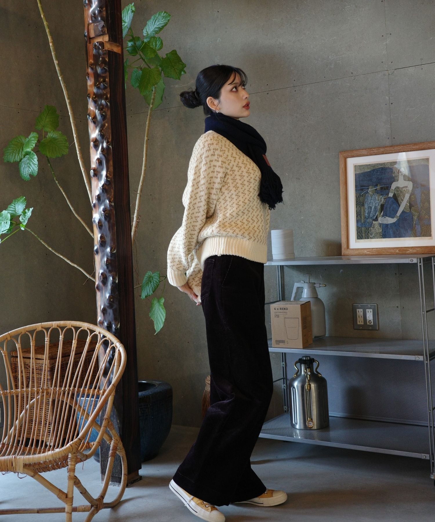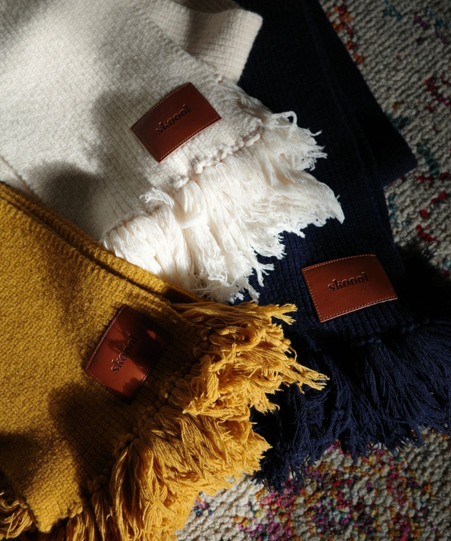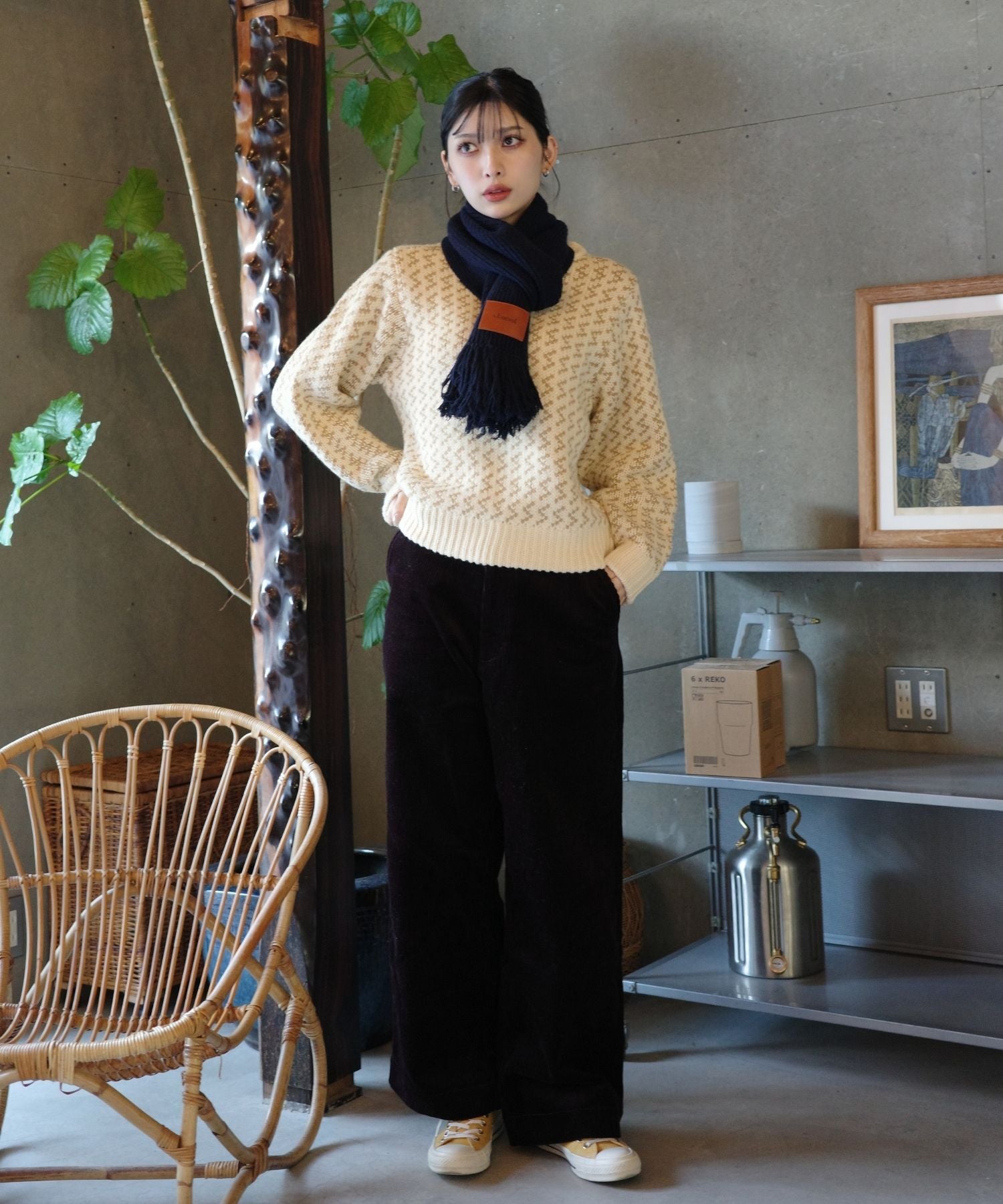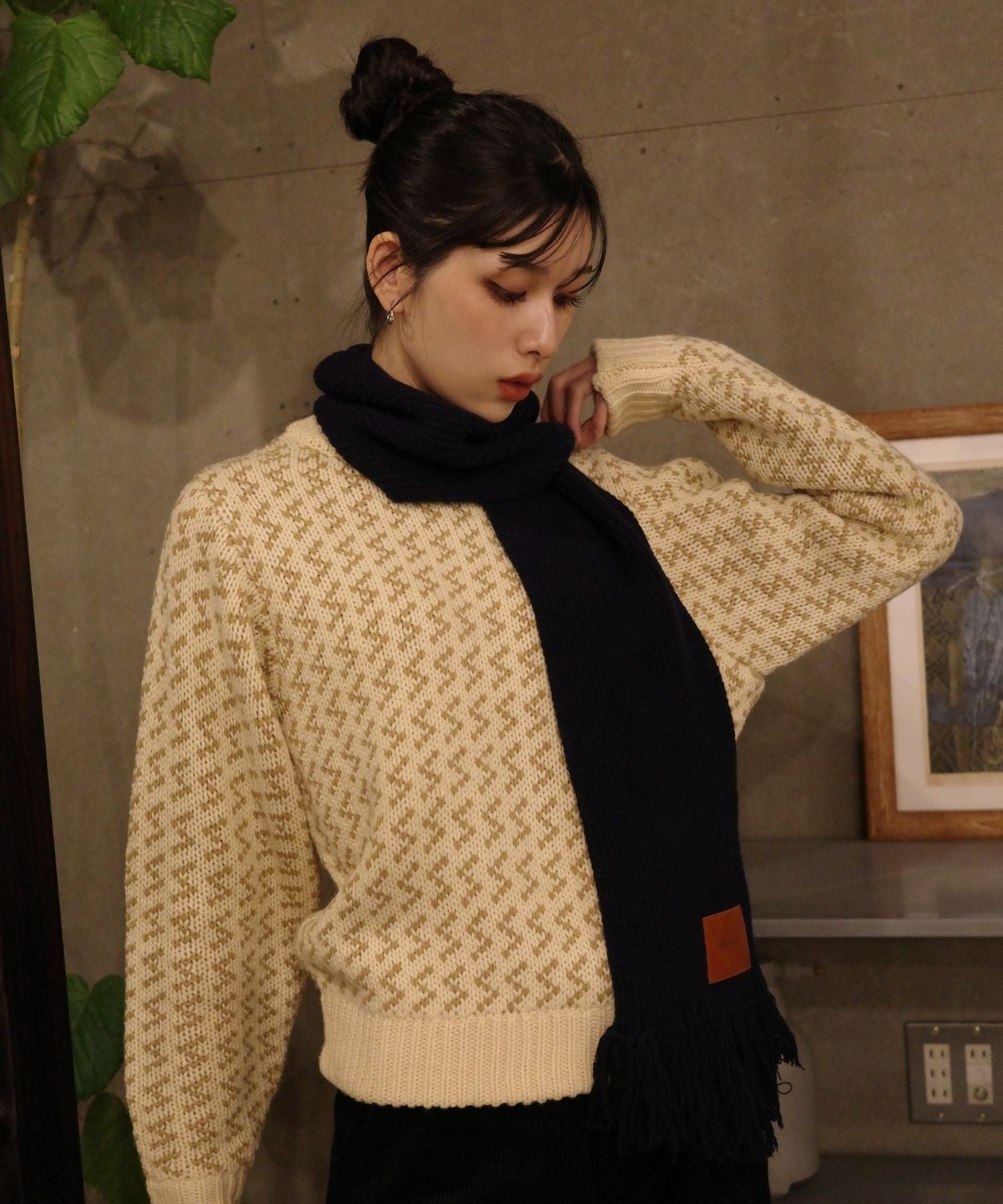が出すぎない上品なリブ編みで、巻きやすく扱いやすいマフラー。柔らかいウール混で肌あたりが優しく、デイリーに使いやすい。端のフリンジは少しボリュームをつけて冬らしく、レザーパッチのブランドロゴが高級感を演出。定番のネイビー・アイボリーに加え、着こなしにアクセントを添えるマスタードも展開。